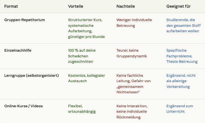 Das hängt von Ihrer Situation ab. Gruppen-Repetitorien eignen sich hervorragend für die systematische Aufarbeitung ganzer Fachgebiete. Einzelnachhilfe ist ideal bei spezifischen Schwächen in einem bestimmten Fach oder für die Thesis-Betreuung. Am besten ist ein Anbieter, der beides anbietet — so können Sie flexibel wechseln.